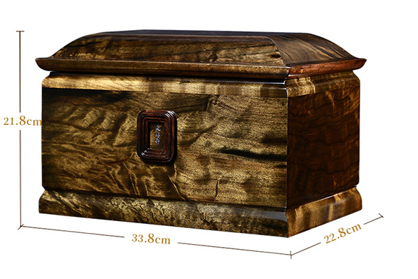 第一、尺寸带八:天顺祥售卖的每一款骨灰盒,盒体尺寸的末尾都是带“八”的数字,公司经典款黄金樟木骨灰盒,寿盒尺寸:21.8*22.8*33.8。公司寿盒带八的规格,既遵循了传统丧葬习俗,又符合制棺匠人的铁律“棺不离八”。古人制作棺材时讲究“棺不离八”,有保佑生者升官发财的寓意。