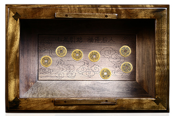 第二、七星引路:七星引路中的“七星”,不是说随便七个铜钱都可以称为“七星”,它是根据清朝七位帝王——顺治、康熙、雍正、乾隆、嘉庆、同治、光绪年号制作的铜钱。按照七星北斗的顺序依次排列成“七星北斗”状,葬俗中称其为“七星引路”。将“七星”铺在骨灰盒底部,有老人脚踏七星指引方向,魂归北斗安乐长眠的寓意。